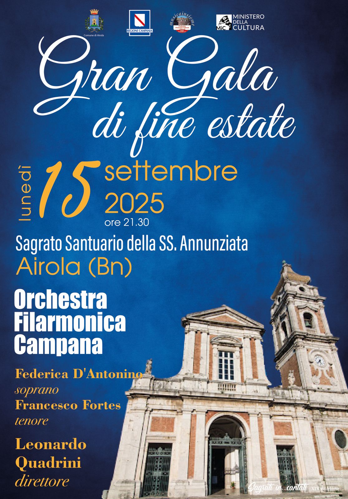 Un concerto che unisce musica lirica e musica sinfonica quello che avverrà ad Airola sul Sagrato della Chiesa dell’Annunziata. Tra i protagonisti il soprano Federica D’Antonino e il tenore Francesco Fortes, accompagnati dall’Orchestra Filarmonica Campana diretta da Leonardo Quadrini. Un omaggio al belcanto, un programma con pagine memorabili tratte da opere di Verdi, Rossini, Puccini, Dvorak, Offenbach, Mascagni e Bizet. Sinfonie, Arie, duetti, terzetti e momenti orchestrali di grande suggestione come la Sinfonia dal Barbiere di Siviglia di Rossini, in apertura di serata, l’Intermezzo da Cavalleria rusticana di Mascagni e il Preludio dalla Carmen di Bizet. Federica D’Antonino, giovane soprano già presente su palcoscenici di prestigio, ci farà ascoltare celebri arie come “O mio babbino caro” da Gianni Schicchi di Puccini, “Vissi d’arte” dalla Tosca di Puccini e l’incantevole aria di Rusalka “Canzone alla luna” di Dvorak. Sarà al fianco di Francesco Fortes nell’indimenticabile duetto “Libiam né lieti calici” dalla Traviata di Verdi. Il tenore interpreterà anche le celebri “E lucevan le stelle” dalla Tosca e “Nessun Dorma” dalla Turandot. La lirica sarà intermezzata inoltre da brani di Ennio Morricone, come “Nuovo Cinema Paradiso”, “Per un Pugno di dollari”, “Mission” e da brani solo sinfonici come le Danze popolari di Johannes Brahms e Antonin Dvorak. Gran finale a due voci, con un omaggio alla canzone classica napoletana con nuovi arrangiamenti per soprano, tenore e orchestra sinfonica.