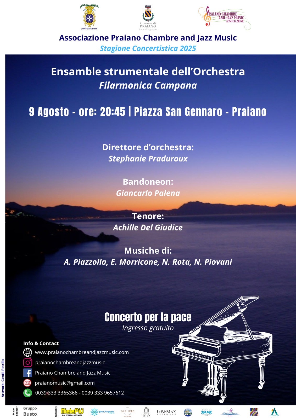 Questo concerto, organizzato dal Comune di Praiano nell’ambito del Praiano Chambre and Jazz Festival è un evento benefico volto a sensibilizzare il pubblico sull’urgenza di promuovere la pace e sostenere chi soffre a causa delle emergenze sociali causate dai conflitti. Attraverso la musica di Astor Piazzolla, Ennio Morricone, Nicola Piovani, Nino Rota, ci faremo portavoce di un messaggio universale: la pace è un diritto di tutti, e ciascuno di noi può fare la differenza. Non sarà solo un concerto, ma un grido d’unione contro la violenza e l’indifferenza. L’evento sarà un’importante testimonianza di come la musica sia uno strumento universale di solidarietà, un veicolo di cambiamento sociale e sensibilizzazione. Proprio quando rischiamo di abituarci alle guerre, non dobbiamo smettere di parlare di pace e di sperare in un mondo migliore, fondato su comprensione, dialogo e aiuto reciproco. Sul podio torna la direttrice valdostana Stephanie Praduroux così come si tratta di un ritorno la partecipazione solistica di un talento del bandoneon e della fisarmonica Giancarlo Palena.