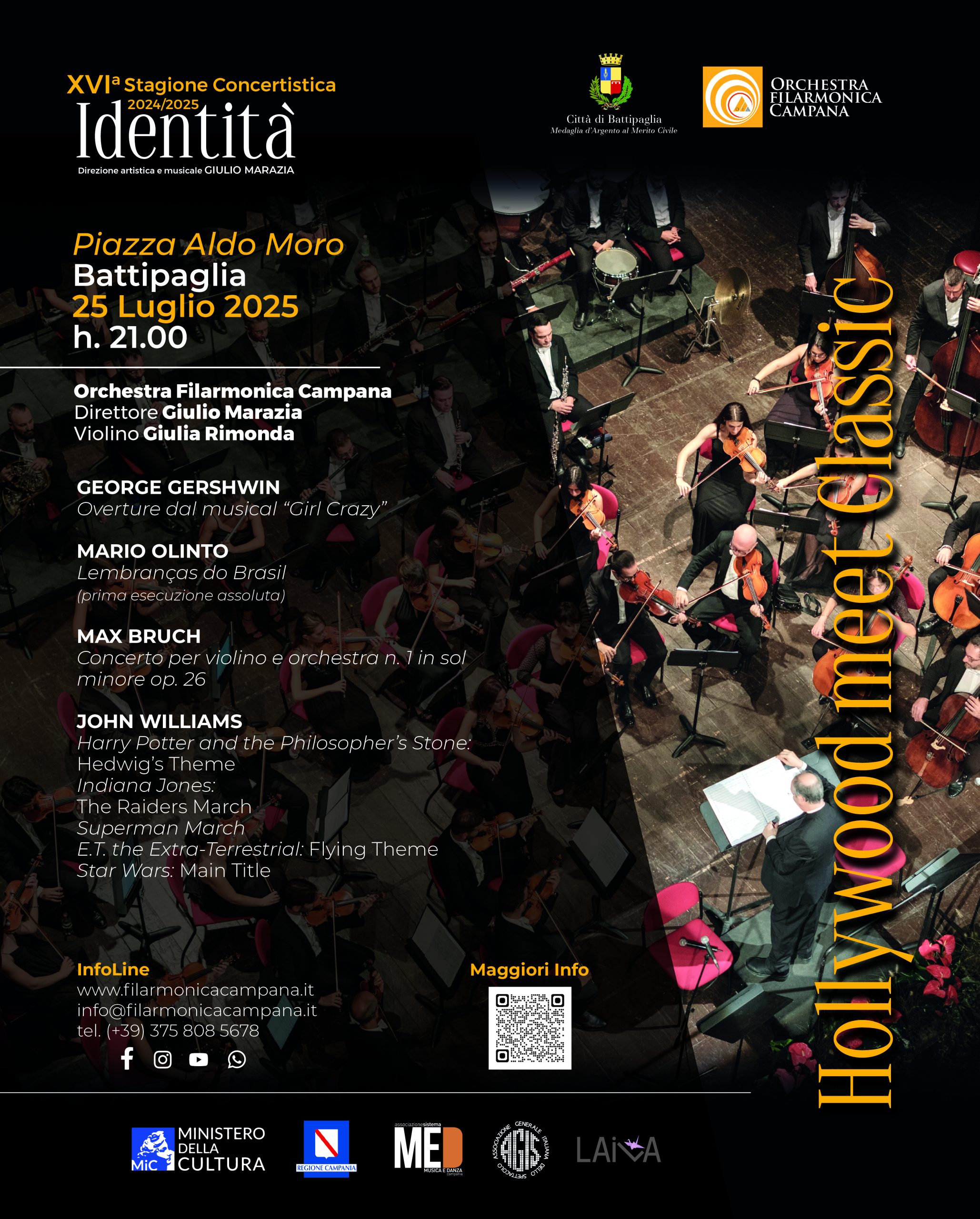 La musica in generale è sempre molto coinvolgente e, con i suoi temi, i suoi ritmi e le sue armonie ha un ruolo essenziale anche all’interno dei film, presentando in questo modo una varietà di aspetti, che offre più elementi di riflessione. Facendo dei distinguo abbiamo le musiche originali composte appositamente per un film, quindi inedite, e poi abbiamo le musiche non originali ovvero già composte, reperibili nel panorama musicale esistente e già edito: un film può contenere sia le une che le altre. Questo concerto indaga proprio il rapporto che esiste tra la musica classica (già esistente) e la musica da film (scritta appositamente per il grande schermo). La prima parte del concerto è dedicata a brani di musica classica che sono stati utilizzati in film hollywoodiani. Si apre con l’Overture Girl Crazy di George Gershwin scritta per il musical omonimo ed utilizzata anche nel film che ne ha tratto l’origine. Andato in scena nel 1930, è tra i più grandi capolavori della tradizione americana, ha decretato l’ascesa di Ginger Rogers nel pantheon delle attrici, mentre nella versione cinematografica il cast includeva Mickey Roneey e Judy Garland. A seguire la prima esecuzione assoluta di Lembranças do Brasil di Mario Olinto che evoca con nostalgia alcuni momenti vissuti in Brasile da una coppia di amici. Nella composizione si fa ampio uso della politonalità principalmente per aggiungere colore armonico ai ritmi brasiliani presenti in esso, in contrapposizione ad altri temi più morbidi ma di egual fascino. Chiude la prima parte il concerto per violino n. 1 di Max Bruch utilizzato nel film “Scrim” di Jacob Bijl dove la fotografa Maria incontra Ann, la moglie del suo amante Jim. Dato che Jim è in prigione, le donne litigano per averlo in sua assenza. La musica qui viene utilizzata come supporto nel creare l’atmosfera, sottolineare le emozioni e guidare lo spettatore attraverso la trama. Nella seconda parte del concerto protagonista invece la musica originale da film con alcuni dei temi musicali più noti di John Williams, compositore beneamato e conosciuto in tutto il mondo. Sul podio dell’Orchestra Filarmonica Campana torna il maestro Giulio Marazia, solista la violinista Giulia Rimonda che torna ad esibirsi per la sua terza volta con l’orchestra nell’ambito del programma di residenza a lei affidato.