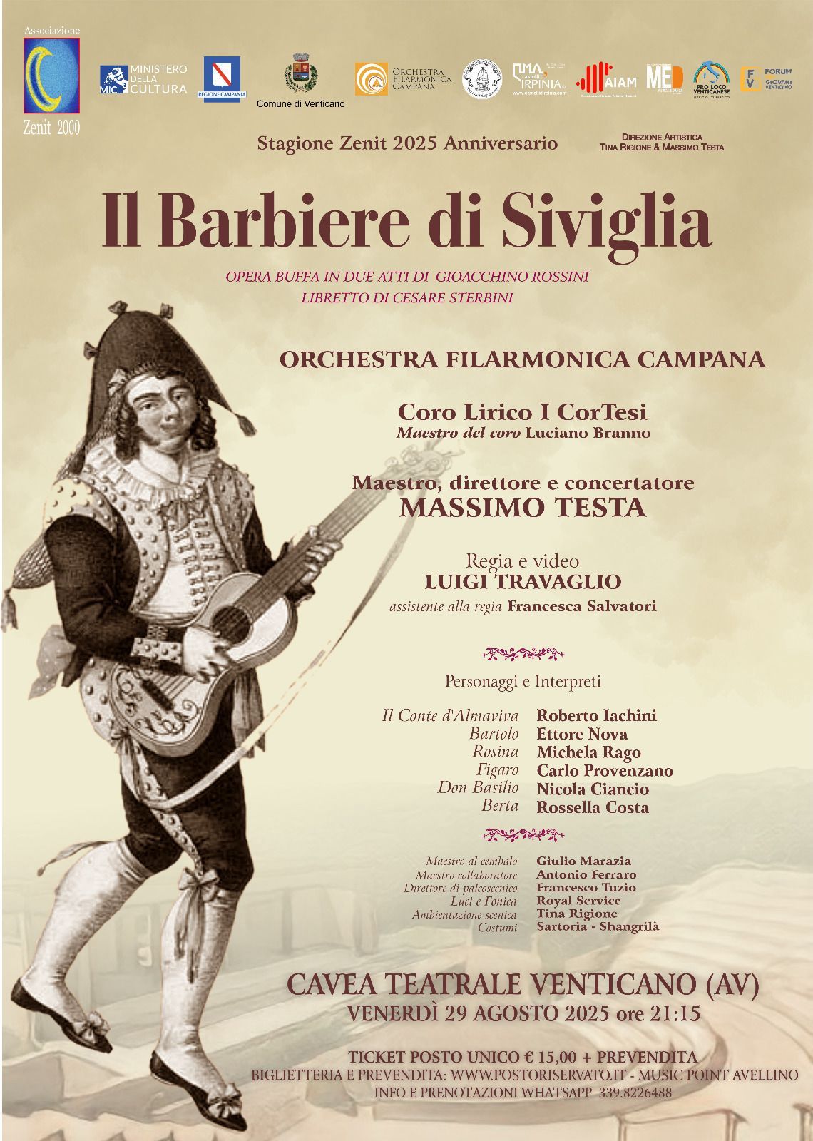 «Fate sempre Barbiere! Sempre Barbiere!», suggerì Beethoven a Rossini incontrandolo a Vienna. «Io confesso che non posso fare a meno di credere che Il barbiere di Siviglia, per abbondanza di vere idee musicali, per verve comica e per verità di declamazione, sia la più bella opera buffa che esista». Così scrisse Verdi a un critico francese nel 1898. Rossini non conobbe mai un successo maggiore del Barbiere. Ancora oggi quel lavoro, che debuttò nel 1816 al Teatro Argentina di Roma, è l’opera buffa più famosa nel mondo. Praticamente ogni suo numero è un gioiello musicale: «Largo al factotum» (Figaro), «La calunnia» (Don Basilio), «Una voce poco fa» (Rosina), il concertato «Zitti zitti, piano piano» e altro ancora. La messa in scena è curata ed organizzata dall’Associazione Zenit 2000, dove per questa produzione siamo orchestra ospite. Sul podio segnaliamo il ritorno del Maestro Massimo Testa.